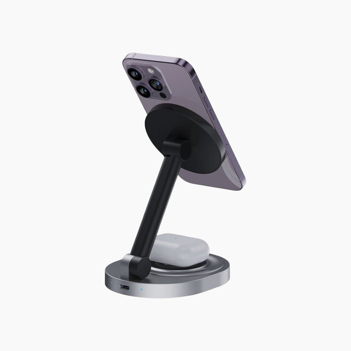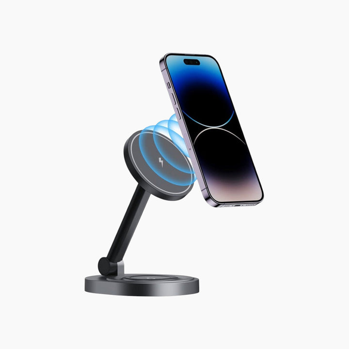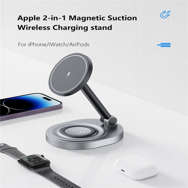 Streamline your charging setup with the 2 in 1 Magnetic Wireless Charger Stand — a sleek and durable solution that effortlessly powers both your iPhone and Apple Watch in one compact stand. Crafted with high-quality aluminum alloy, this charger combines fast charging, strong magnetic alignment, and travel-friendly portability.