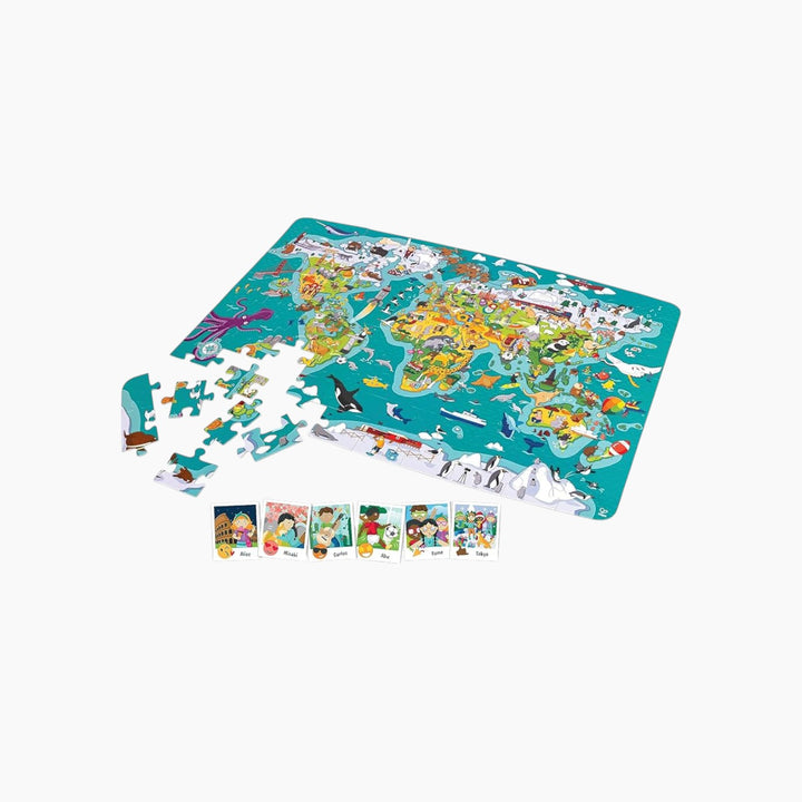- Pieces & Accessories: 100 durable cardboard puzzle pieces, 4 charming wooden explorer figures, a dice, and a double-sided educational poster (87 × 57 cm).