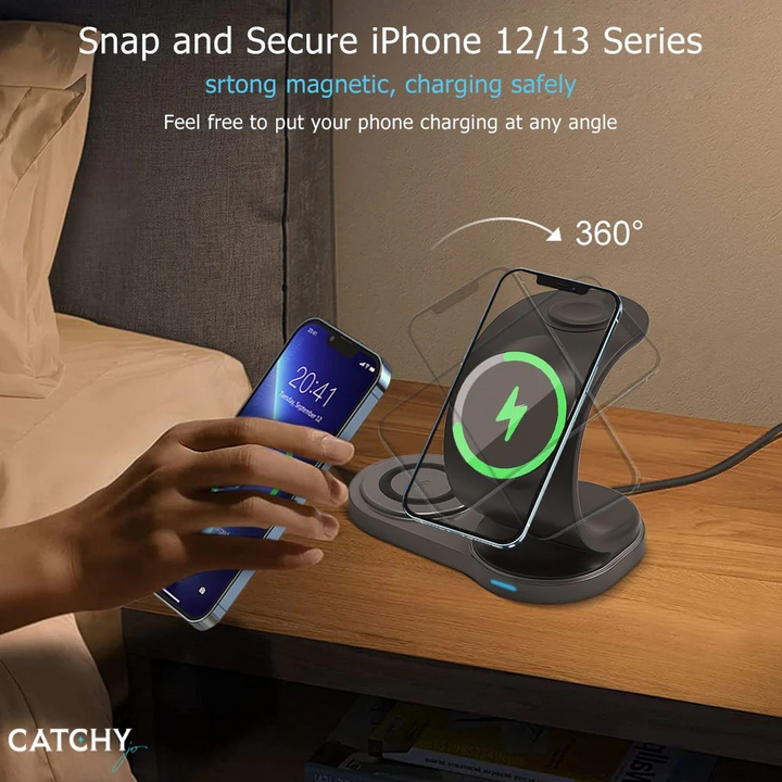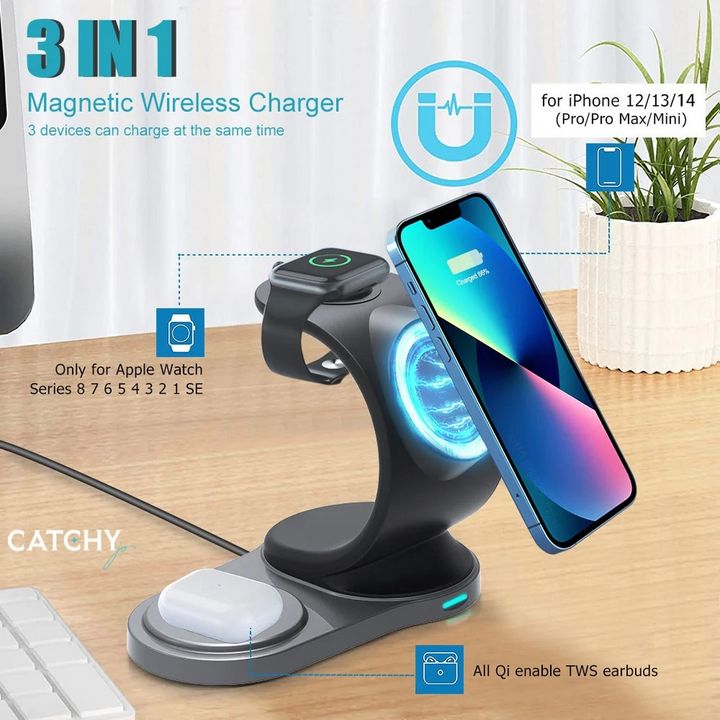 - Compatibility: iPhone (MagSafe / iPhone 12 and newer) + Apple Watch + AirPods Pro simultaneous charging.