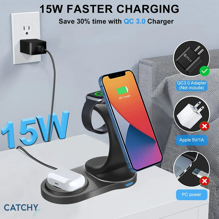 • Declutters your space by replacing three separate chargers with one unified stand — ideal for desk, nightstand or home-office use.