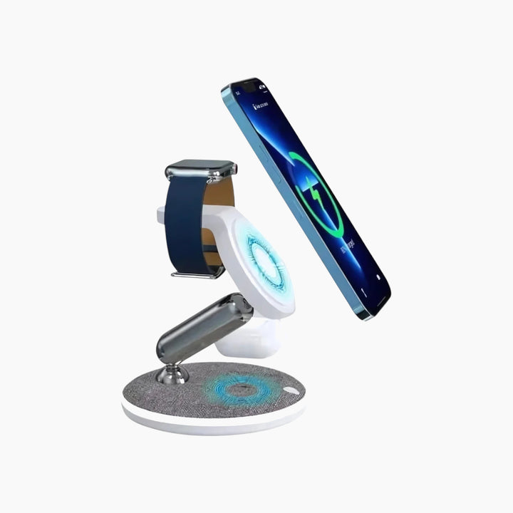 Revolutionize your workspace with the 4 in 1 Magnetic Wireless Foldable Stand, a sophisticated and versatile charging hub designed for seamless power and organization.