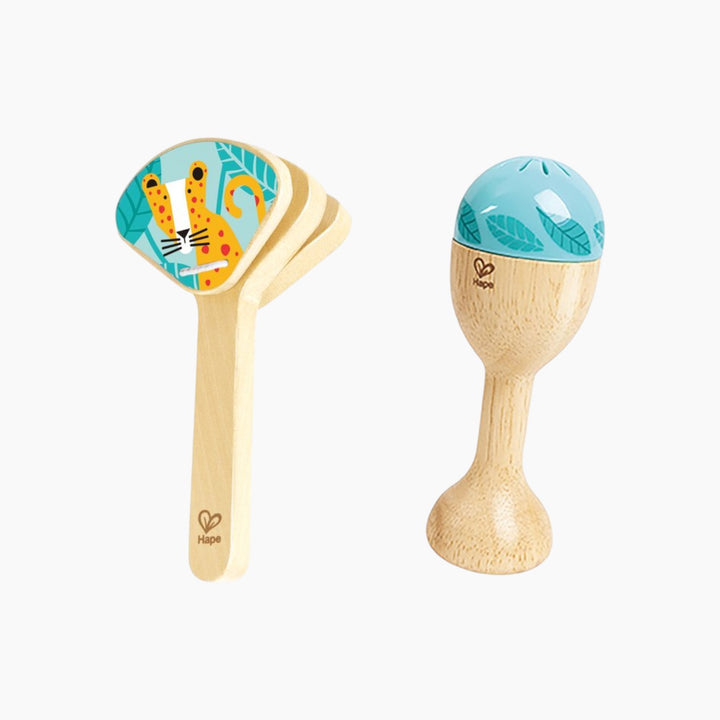 A delightful ensemble designed for young musicians aged 3 and up. This set comprises a ukulele, tambourine, maraca, and castanet, crafted from natural wood and high-quality plastic with non-toxic paints. Perfect for introducing rhythm and musical exploration, each instrument offers realistic sound and a comfortable, easy-to-use design, encouraging kids to engage in group play.