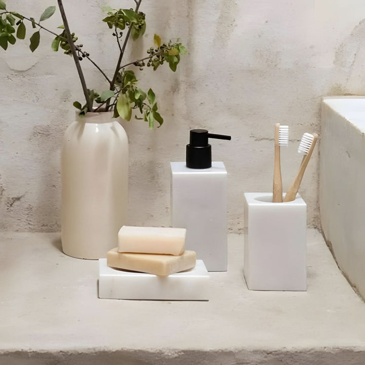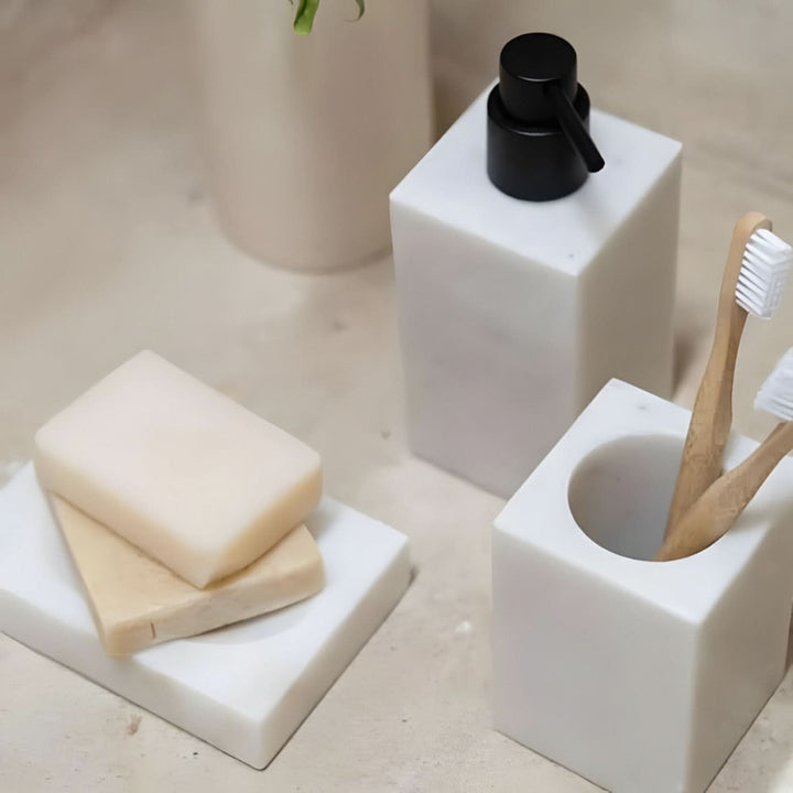 نقدم لكم موزع صابون اليدين السائل المربع الأنيق، الذي يجمع بين العملية والأناقة. مصنوع من الرخام الأبيض الرائع، يضفي هذا الموزع لمسة من الرقي على أي حمام أو مطبخ.