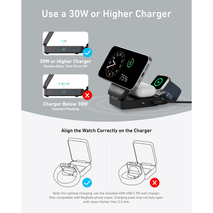 Experience the convenience of a single, compact solution that keeps your iPhone, Apple Watch, and AirPods ready for action, whether at home or on the go. Its foldable design makes it an ideal travel companion, minimizing space while maximizing charging capability.