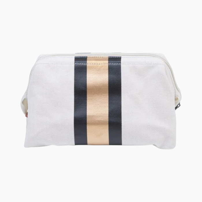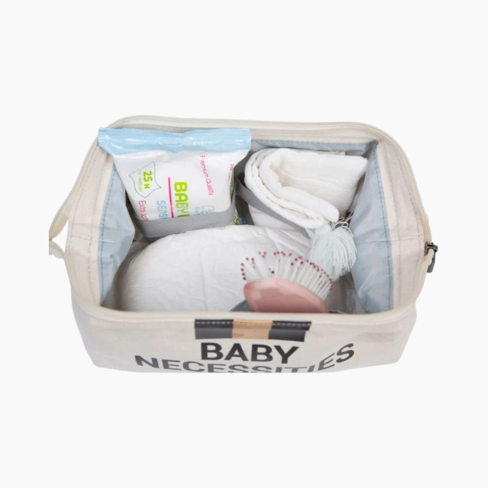 A chic and practical solution for organizing baby essentials. Its off-white stripe design with black and gold accents exudes elegance while providing functionality. Crafted from high-quality materials, the water-repellent design ensures that everything stays safe and dry, whether at home or on the move. Its spacious interior makes room for diapers, baby wipes, care products, or a washcloth, keeping everything within reach.