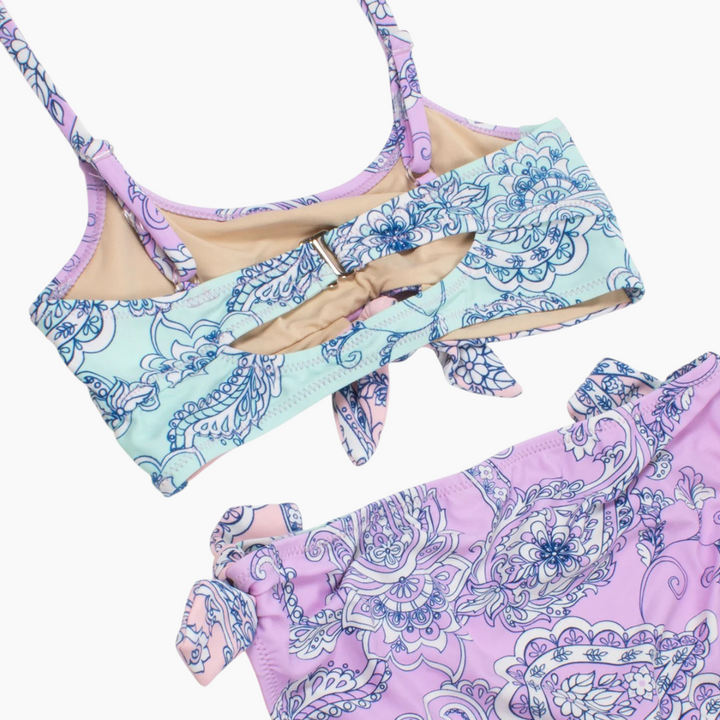 Elevate swimwear style with this stunning two-piece bikini, featuring a vibrant paisley colorblock design. Perfect for children who love to make a splash, this kids' swimwear...