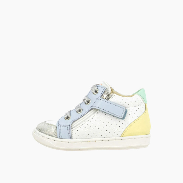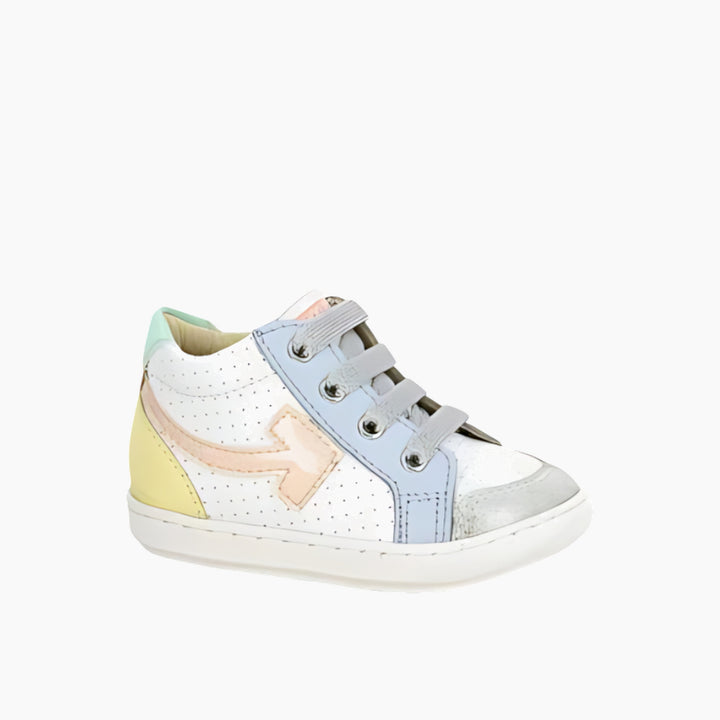 Discover the perfect first-step shoe crafted with precision and style. The Bouba Arrow Pastel combines white perforated leather with vibrant pastel glittery canvas accents, including smooth leather yokes in shades of orange, yellow, and blue. Designed with a lightweight, flexible sole, this shoe supports natural foot movement while the high upper provides excellent ankle stability. An inner zip ensures easy adjustment and a secure fit, making it a parent and podiatrist favorite.