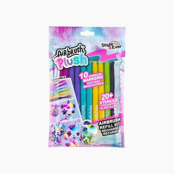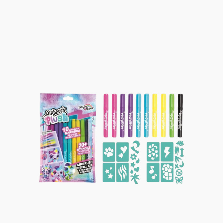 An essential accessory for enhancing the Airbrush Plush decorating experience. This kit includes 10 chalk-based markers and 2 sheets of reusable stencil designs, allowing for endless customization possibilities. Ideal for young artists aged 6 and up, it encourages creativity and fine motor skills development.