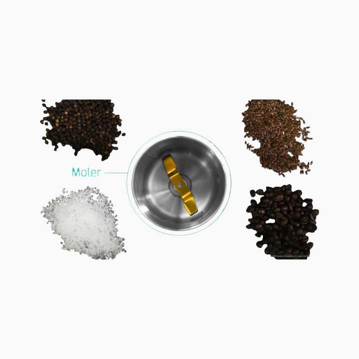 - طحن DuoClean النظام: يتميز بوعاءي طحن قابلين للتبديل - وعاء للقهوة وآخر للتوابل - للحفاظ على نقاء النكهات ومنع التلوث المتبادل. سعة كبيرة ٧٥ غرامًا: طحن كمية كافية من القهوة لحصص متعددة أو كمية كبيرة من التوابل دفعة واحدة. شفرات متينة من الفولاذ المقاوم للصدأ: مصممة لطحن طويل الأمد وفعال، مما يوفر ملمسًا ناعمًا أو خشنًا باستمرار حسب الحاجة. تشغيل بلمسة واحدة: سهل الاستخدام وبديهي، مما يسمح بتحضير مكوناتك بسرعة وسهولة. تصميم صغير وأنيق: هيكله الأنيق المصنوع من الفولاذ المقاوم للصدأ والبلاستيك الخالي من مادة BPA يُكمل أي تصميم جمالي للمطبخ مع شغل مساحة صغيرة على الطاولة. سهل التنظيف: مصمم لسهولة الصيانة، مما يضمن لك الاستمتاع بقهوة طازجة دون عناء. ضجة التنظيف.