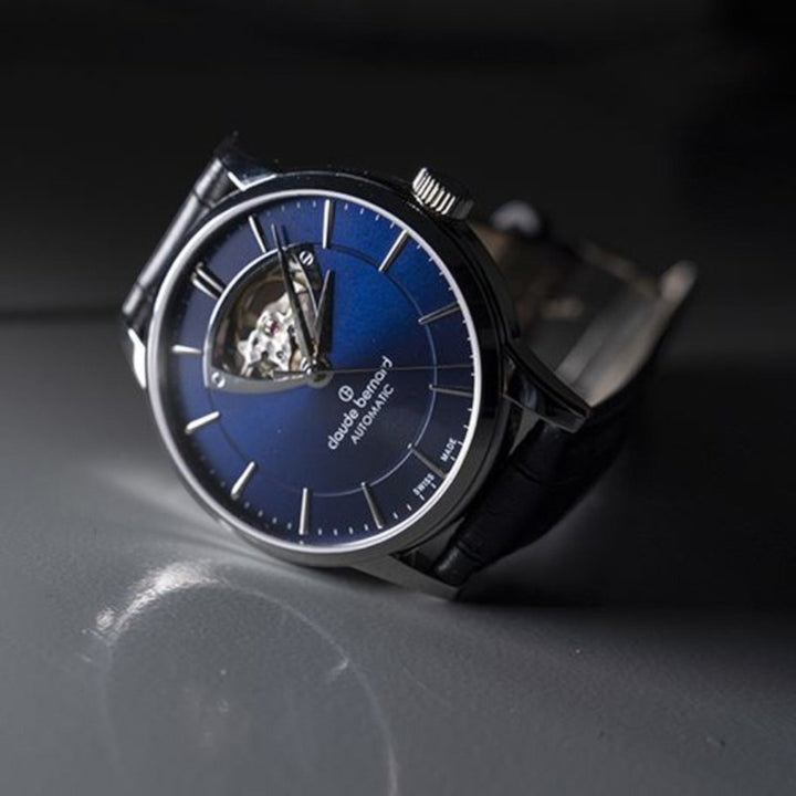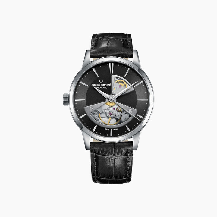 The captivating open-heart dial reveals the intricate beating heart of the Swiss automatic movement, a testament to Claude Bernard's commitment to horological excellence. Crafted for those who appreciate both form and function, this watch is a distinguished companion for any occasion.