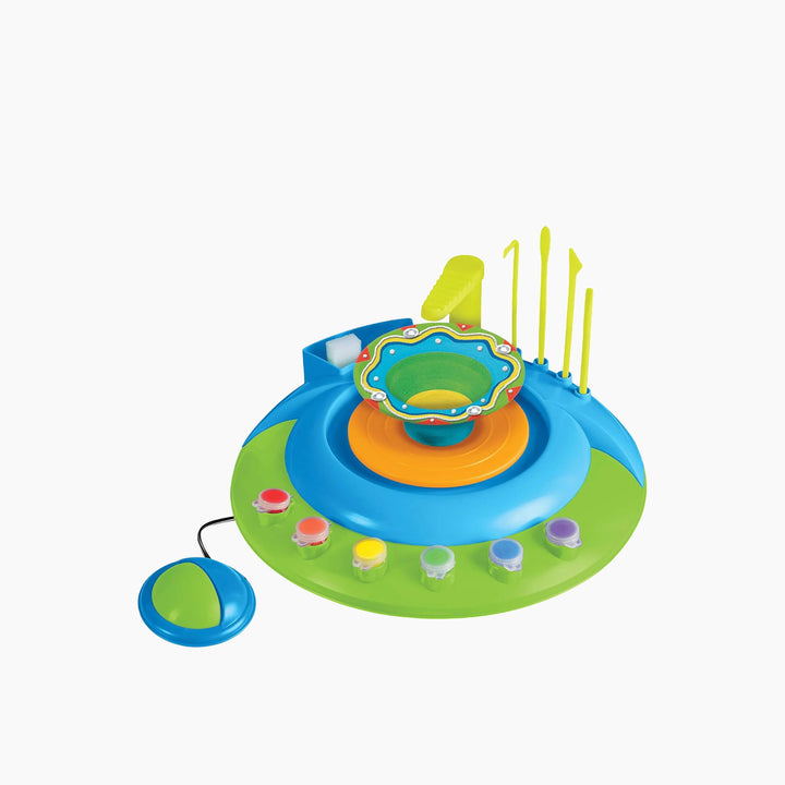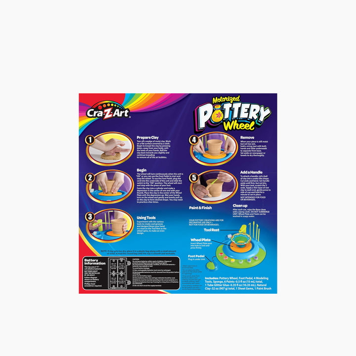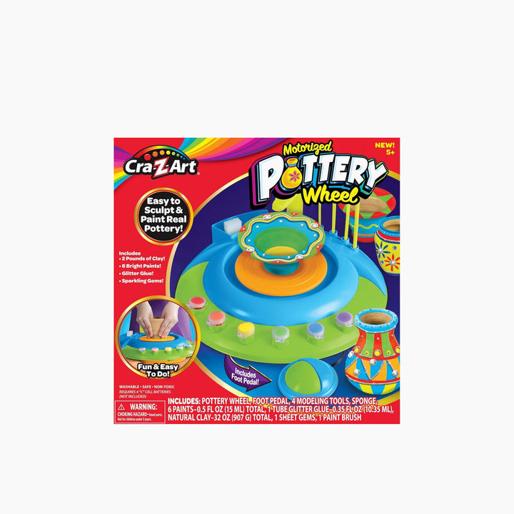 - Components: Pottery wheel, foot pedal, 4 modeling tools, sponge, 6 paints, 1 tube glitter glue, 32 oz natural clay, 1 sheet of gems, 1 paintbrush