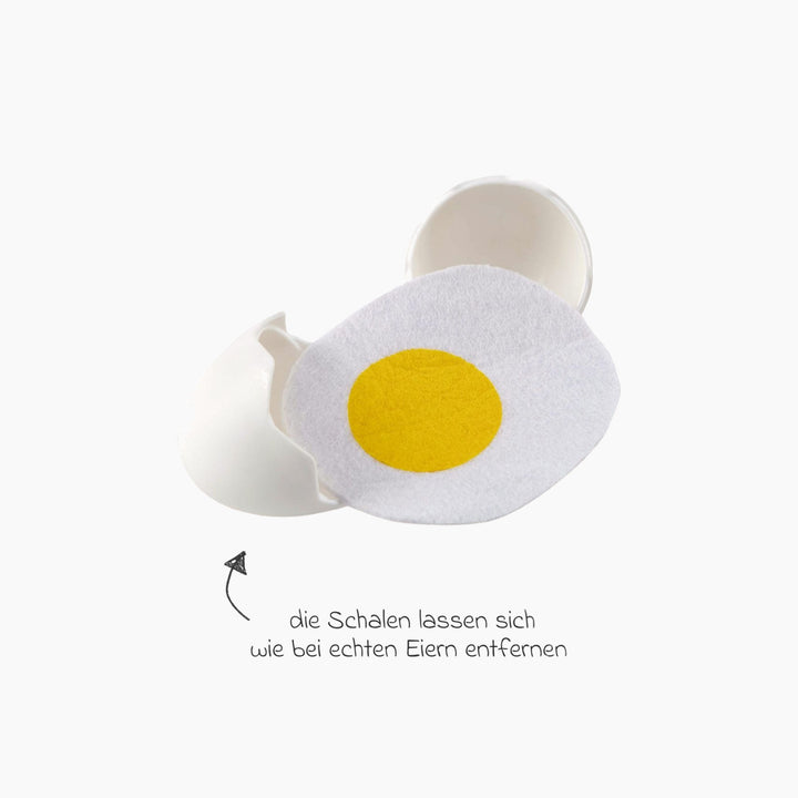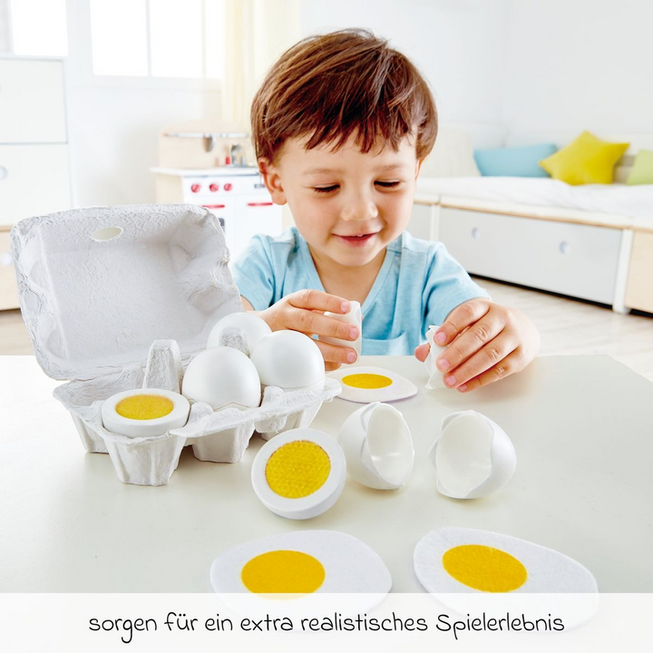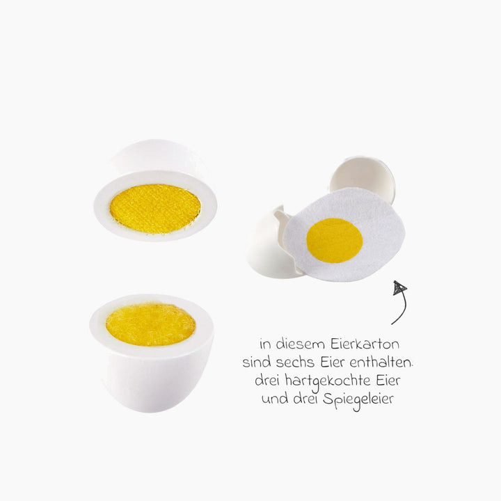Introduce young chefs to the delightful world of culinary role play with this charming wooden egg carton playset. Designed for imaginative fun and healthy eating awareness, it features six lifelike eggs nestled in a cardboard-style carton—three whole and three that can be split open to reveal hard-boiled halves. Crafted from high-quality natural wood and painted with non-toxic, child-safe colors, it's a safe and durable addition to any play kitchen.
