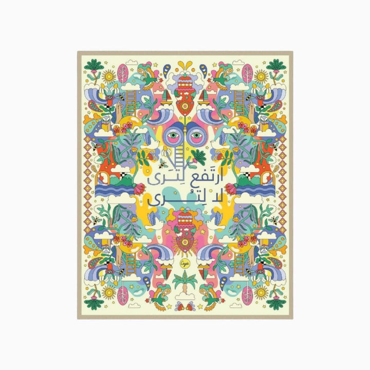 عمل فني ملون وملهم من إبداع الفنانة آية مبيضين، يدعو المشاهدين إلى الارتقاء بمنظورهم. إنه مثالي لإضافة لمسة من الإيجابية والإبداع إلى أي مساحة.