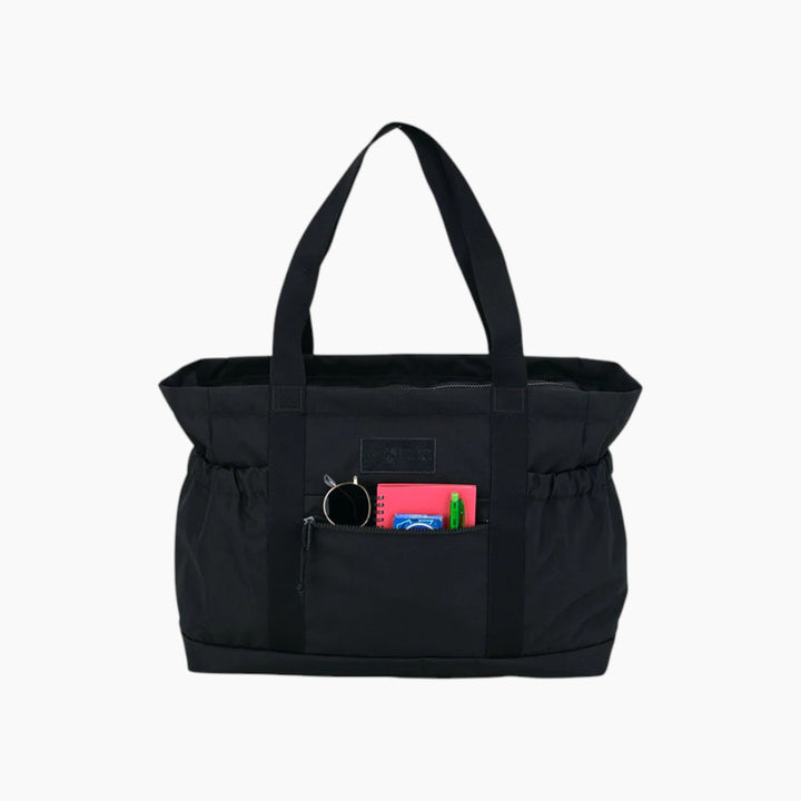 Perfect for the modern, on-the-go lifestyle. This versatile large tote provides ample room for all essentials, featuring multiple zippered compartments, a padded 15-inch laptop sleeve, and deep side pockets designed for water bottles. Its sleek black design makes it ideal for work, travel, or casual outings.