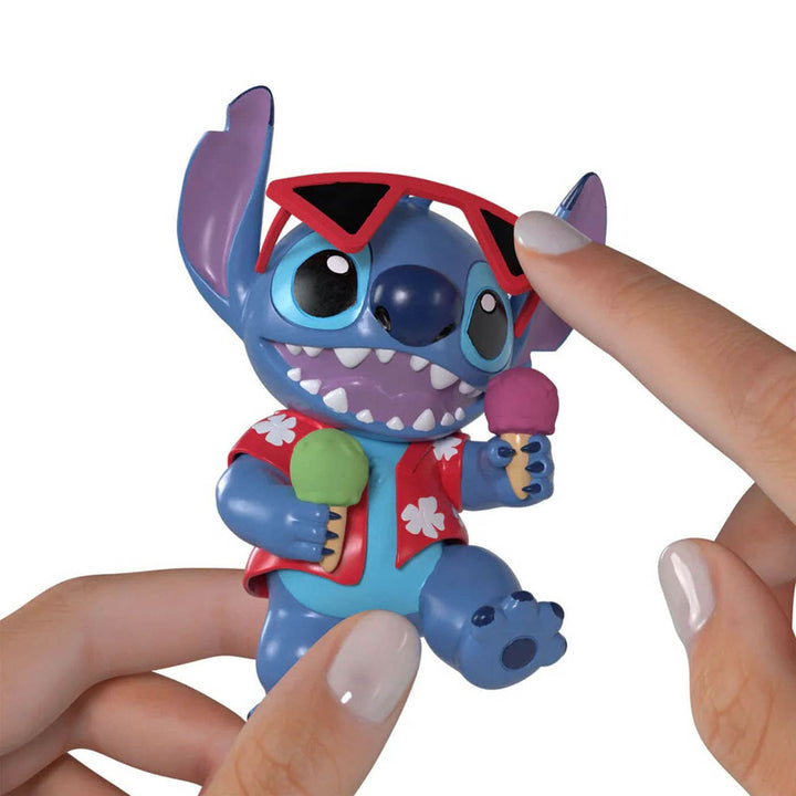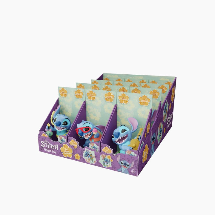 - Set includes: 12 mini figures of Stitch in assorted styles (sunglasses, pineapple, themed outfits) in clear individual boxes inside a CDU open tray
