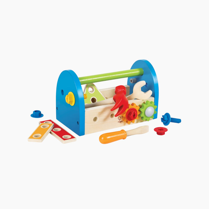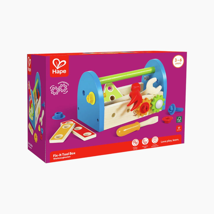 Introducing a captivating wooden playset designed to inspire young builders and ignite imaginative construction play. This Fix It Tool Box Wooden Playset is thoughtfully crafted for children aged 3 and up, encouraging early motor skills and construction thinking. A durable wooden toolbox houses an array of essential tools for endless creative possibilities.