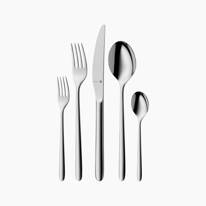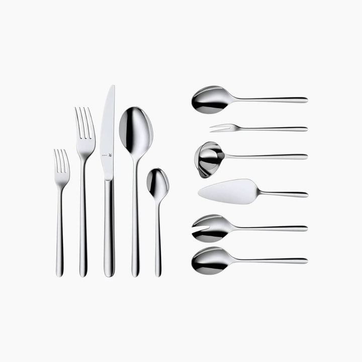 - مجموعة شاملة تتضمن: 12 شوكة، وسكاكين مائدة، وملعقة، وشوكة كيك، وملاعق شاي/قهوة.