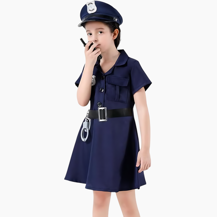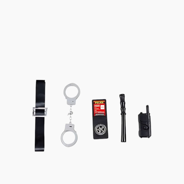 - مجموعة متكاملة: تتضمن فستانًا أزرق كحليًا مع شارة الشرطة، قبعة شرطة مع شارة، حزامًا أسود، بطاقة هوية الشرطة، هراوة الشرطة، جهاز اتصال لاسلكي، وأصفاد.