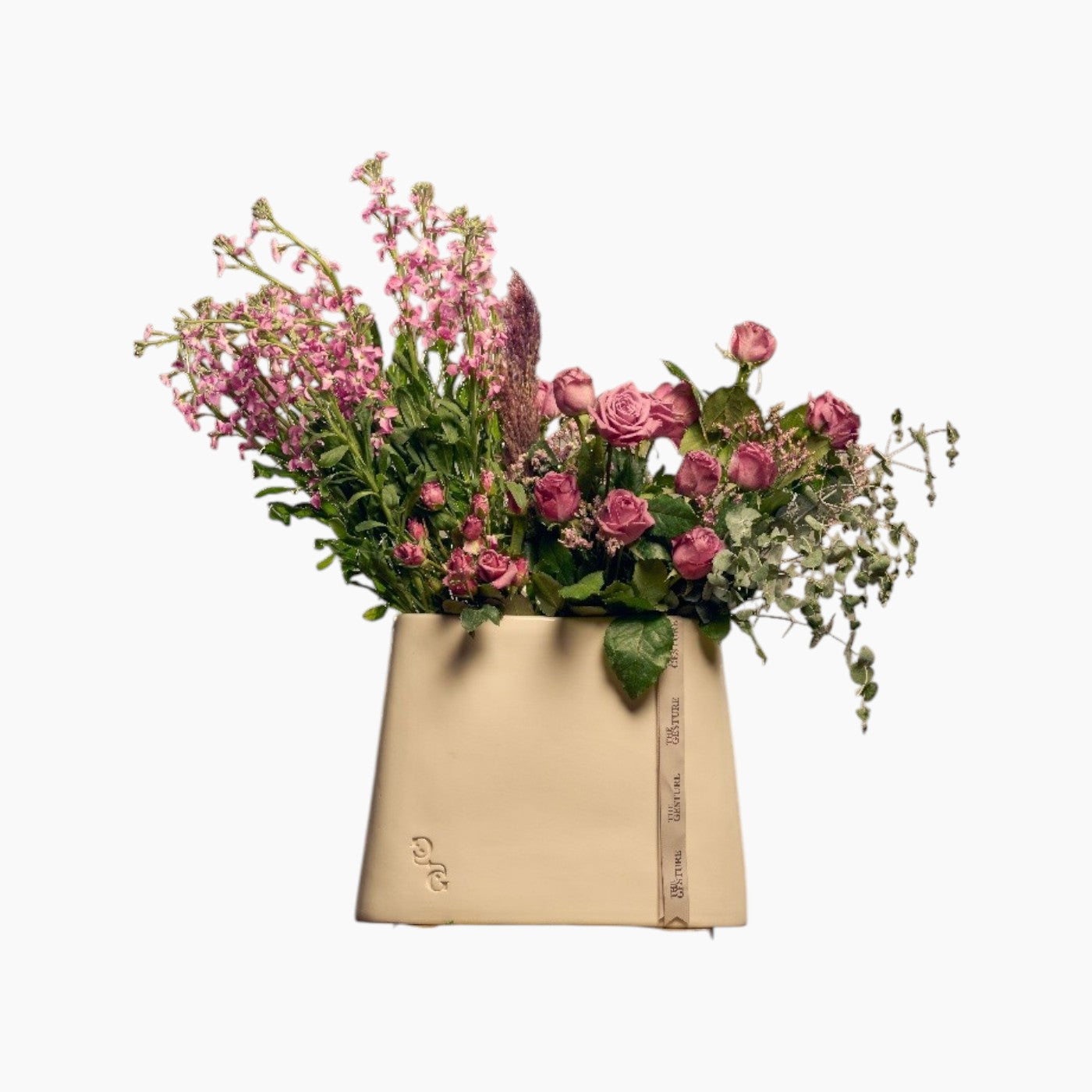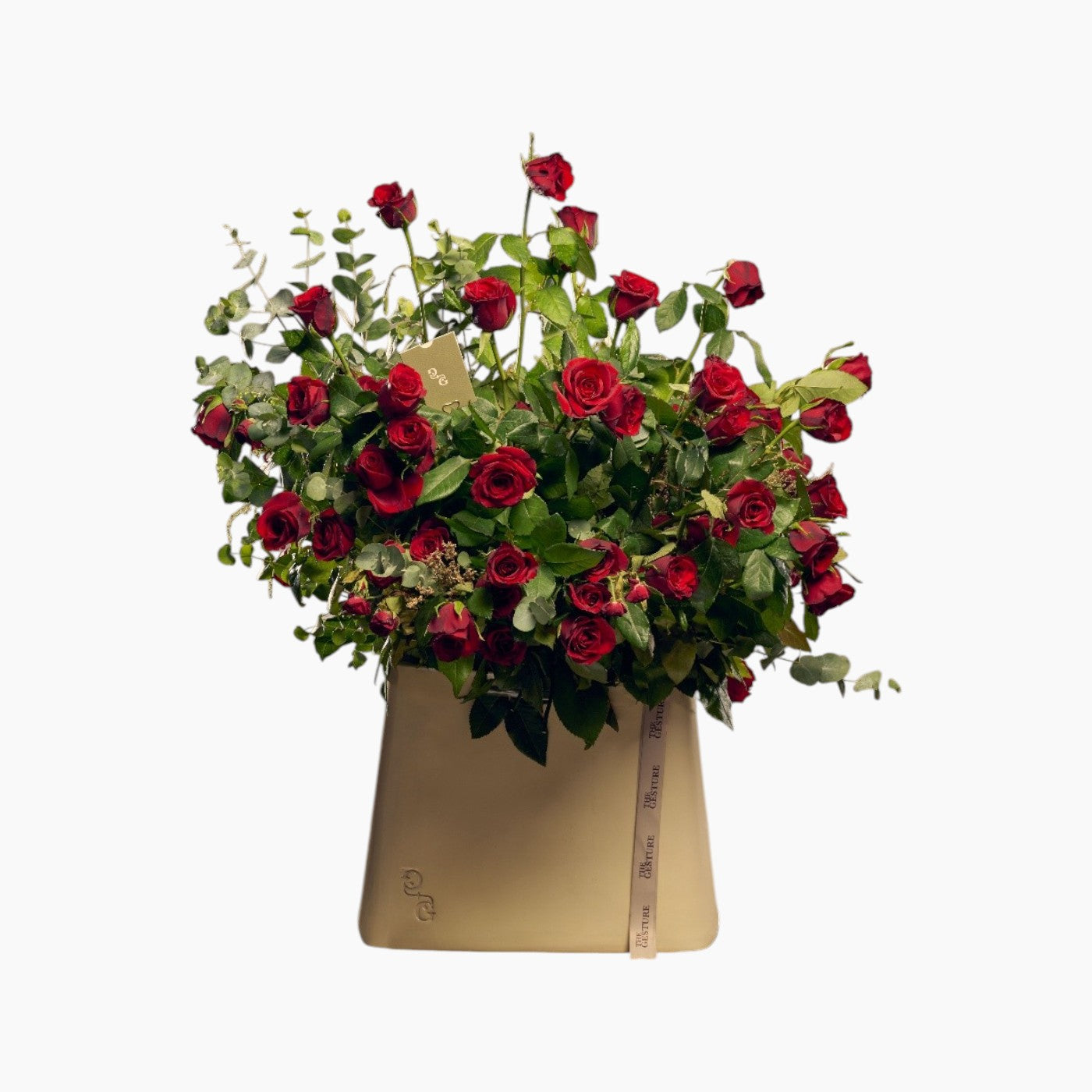 تقدم المزهرية الخزفية الحمراء المصنوعة يدوياً باقة فاخرة من 60 وردة طازجة، تكملها بشكل جميل أزهار رقيقة ونباتات خضراء مورقة. تجمع هذه التنسيقة بين وفرة الأزهار...