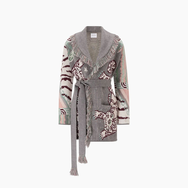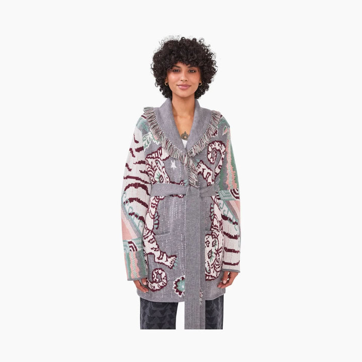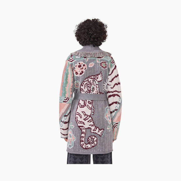 An exquisite jacquard knit woven in extra fine merino wool, crafted with inspiration drawn from the majestic folklore of ancient Tibetan tiger rugs. In soft grey tones, this statement cardigan exudes elegance while retaining a relaxed, wearable silhouette.