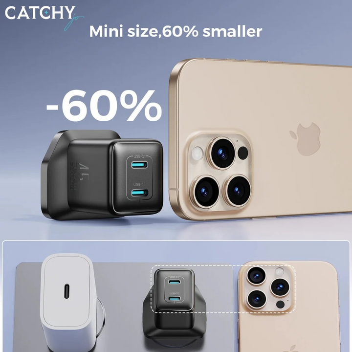 - Benefit from a total output of 45W, efficiently distributing power for a combined charge of 25W and 20W across both ports.