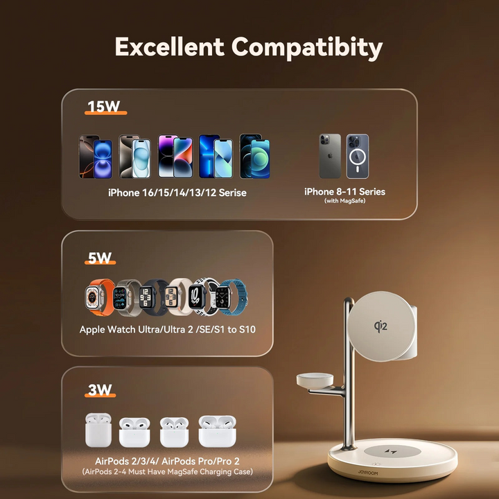 - Seamlessly charge your Qi2.0 compatible phone (up to 15W), smartwatch (3W), and earbuds (5W) all at once, reducing cable clutter and maximizing efficiency.