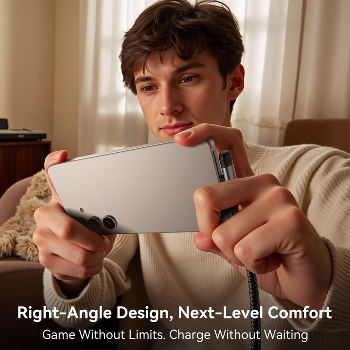 Designed with a smart 90-degree elbow connector, the JOYROOM S-A56 minimizes stress on both the cable and your device's port, promoting enhanced durability and a comfortable user experience, especially during extended gaming sessions or when space is limited.