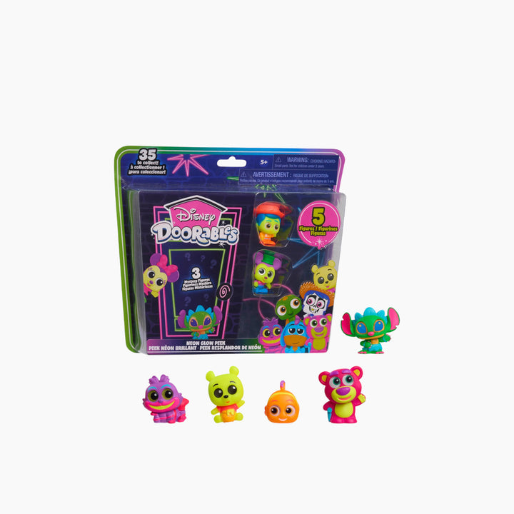 Dive into the excitement of the Neon Glow Peek collection, where iconic Disney figures are reimagined with captivating ultraviolet finishes and signature Doorables sparkle. Get ready to collect them all and illuminate your Disney figurine display.