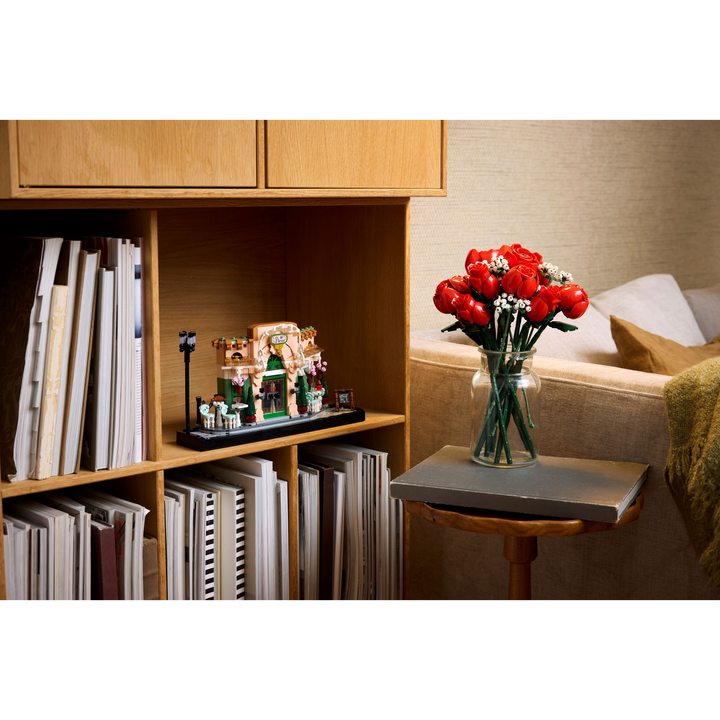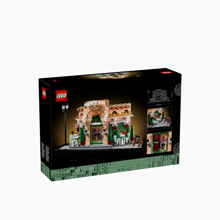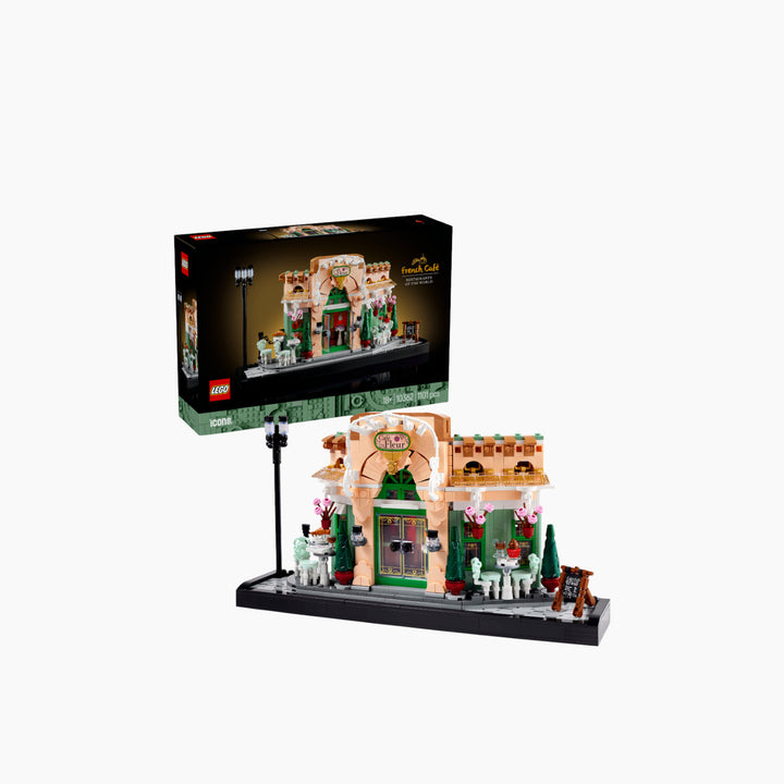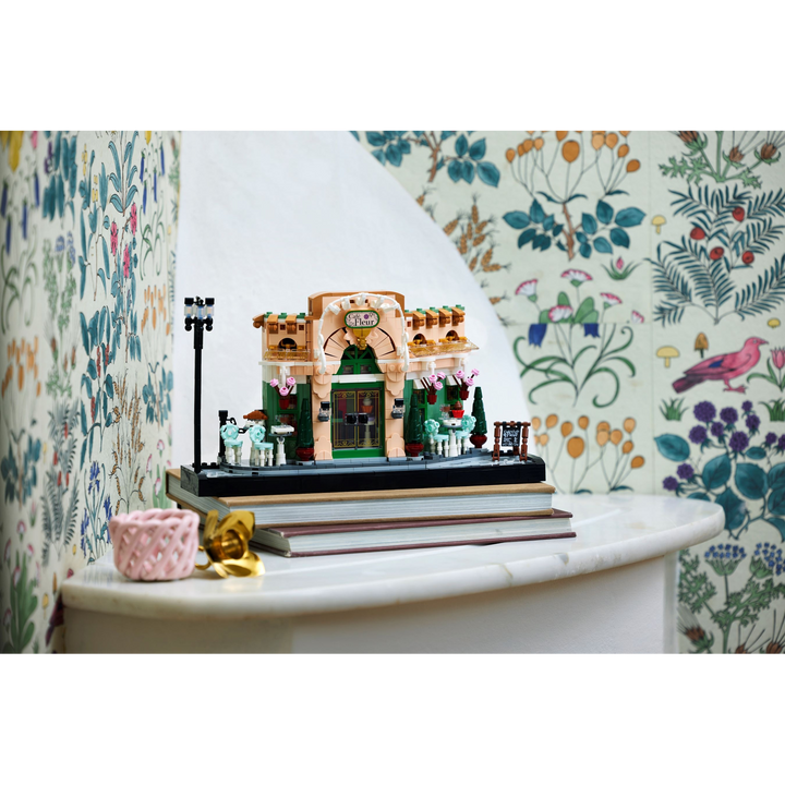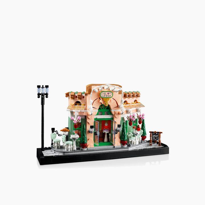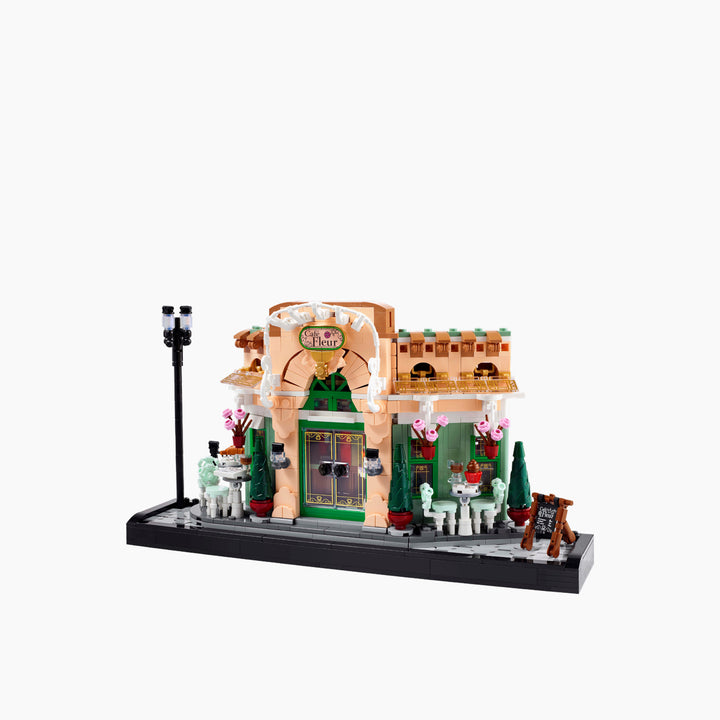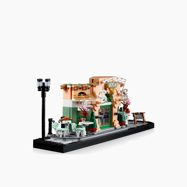 Experience the joy of creation as you assemble a charming brick-built pavement complete with a classic streetlamp, setting the scene for the picturesque façade of Café Fleur. From its ornate seating and charming hanging flowerpots to the inviting double doors that hint at a cozy interior, every detail is meticulously crafted to evoke the essence of a quintessential French bistro.