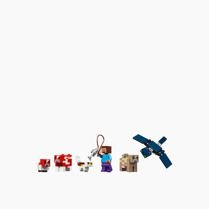 - Character figures included: Steve, red mooshroom, baby red mooshroom, brown mooshroom, calico cat, phantom
