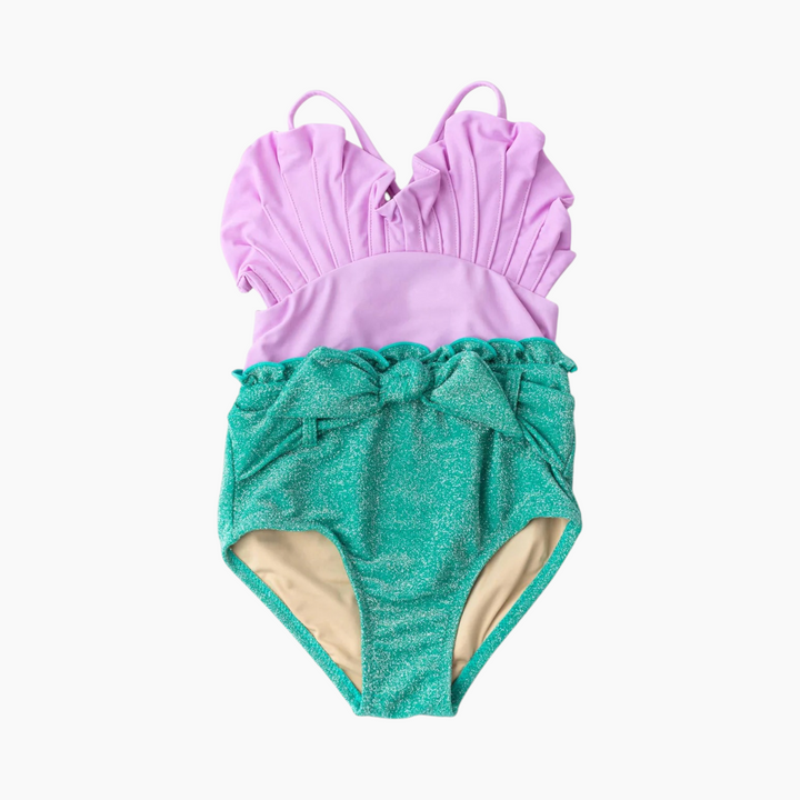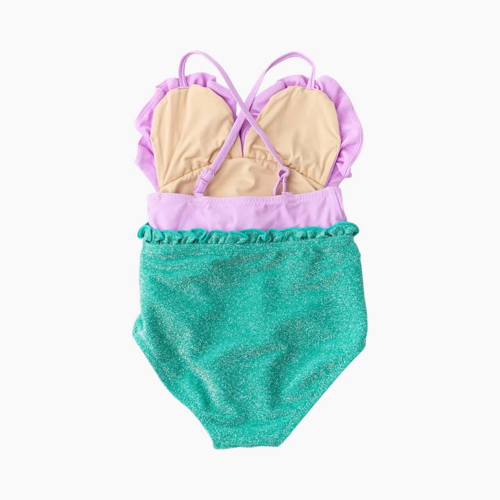 This enchanting one-piece captures the magic of the ocean with its stunning lilac hues and water-reactive mermaid scales. When immersed in water, the scales glisten, creating a captivating look that will make any pool day or beach outing unforgettable. Designed for comfort and style, this swimsuit features a glamorous belted waist and adjustable straps to ensure a perfect fit as your child grows.