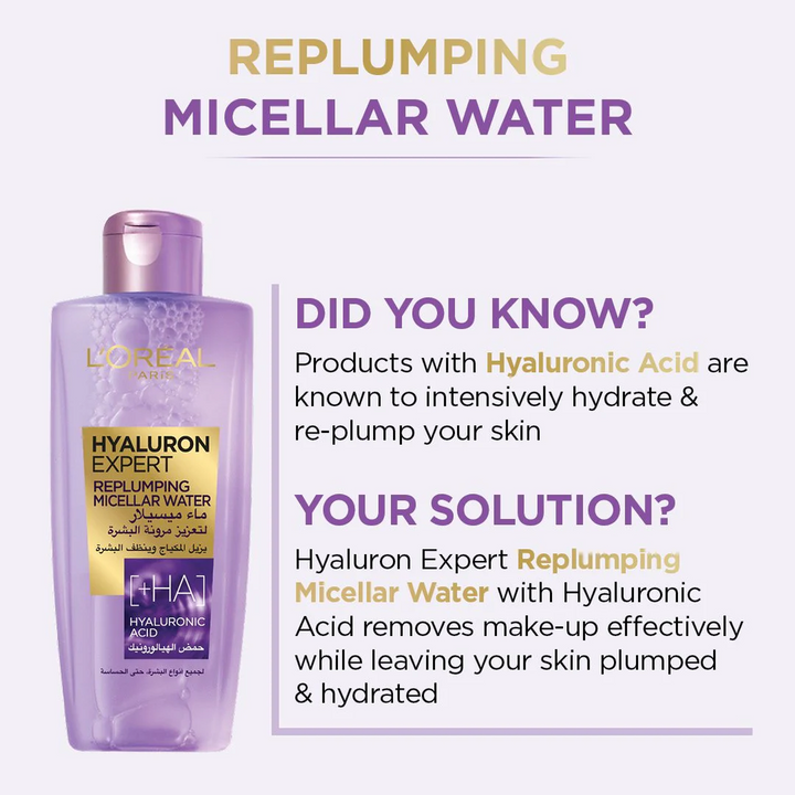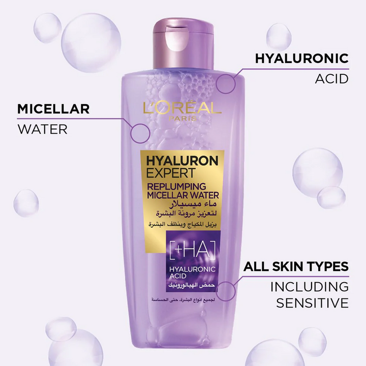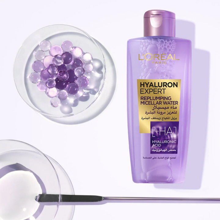 نقدم لكم لوريال باريس هيالورون إكسبيرت ريبلومبينج ميسيلار، منتج رائع يجمع بين العملية والأناقة. هذا المحلول الميسيلاري لا يُرطب البشرة ويُنعمها فحسب، بل يُزيل المكياج بفعالية أيضًا.