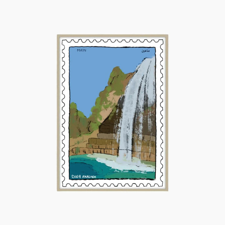 تُعدّ لوحة "ماعين" للفنانة دينا عكشة تحيةً مُنعشة لإحدى عجائب الأردن الطبيعية المحبوبة. صُممت هذه اللوحة على شكل طابع بريدي، وتُصوّر ببراعة الشلال المهيب المتدفق من المنحدرات الوعرة إلى مياه فيروزية نابضة بالحياة، مُبرزةً مزيجه الفريد من العملية والأناقة. تُصوّر هذه اللوحة، التي يبلغ قياسها 21×30 سم، الشلال المهيب المتدفق من المنحدرات الوعرة إلى مياه فيروزية نابضة بالحياة. تُحيط بها الخضرة الوارفة، وتُطلّ على سماء زرقاء صافية، لتستحضر هدوء وحيوية ينابيع ماعين الحارة. تُشكّل هذه اللوحة، المُؤطّرة بالخشب الطبيعي، تذكيرًا مثاليًا بجمال المنطقة الهادئ وسحرها الخالد.