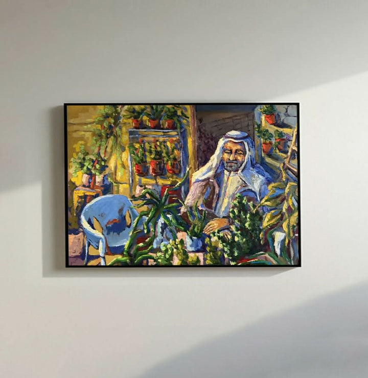 نقدم لكم العمل الفني الرائع "مشتل أبو علي" للفنانة سارة الرمحي، والذي يجمع ببراعة بين العملية والأناقة. تُعدّ هذه القطعة بمثابة تكريمٍ صادقٍ لدفء التقاليد وجمال الحياة اليومية الهادئ. تدعو هذه اللوحة الآسرة، مقاسها 42×30 سم، المشاهدين إلى مشتلٍ غنّاء، حيث يجلس أبو علي، مرتديًا الزي التقليدي، بسلامٍ بين الخضرة النابضة بالحياة والنباتات المحفوظة في أصصٍ مضاءة بنور الشمس. يزخر العمل الفني بضربات فرشاة معبرة وألوان ترابية دافئة، ليُجسّد ببراعة لحظةً من الهدوء المتجذّر في التراث والمجتمع.