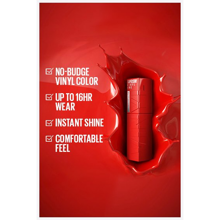 نقدم لكم أحمر الشفاه السائل مايبيلين سوبر ستاي فينيل إنك، منتج رائع يجمع بسلاسة بين العملية والأناقة. يمنحكِ هذا أحمر الشفاه لونًا جريئًا مع لمسة نهائية فينيلية لامعة، ليضمن لكِ إطلالة رائعة طوال اليوم.