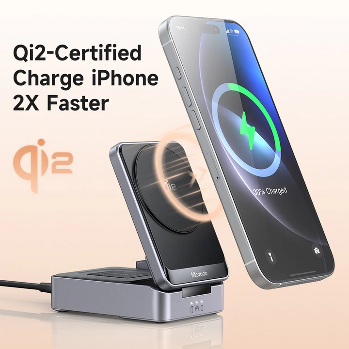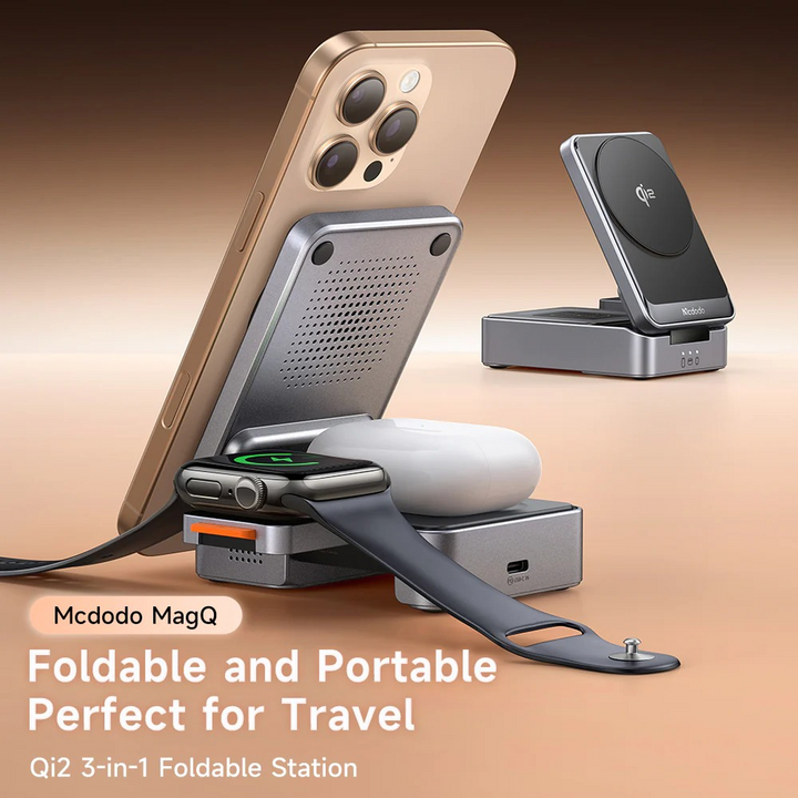 Streamline your charging routine with the MCDODO MagQ Qi2 3-in-1 Foldable Magnetic Wireless Charger (15W). This sophisticated charging station is engineered for modern device users, offering a unified solution to power up your iPhone, Apple Watch, and AirPods simultaneously.