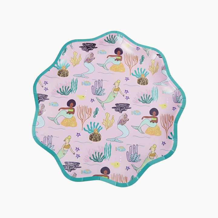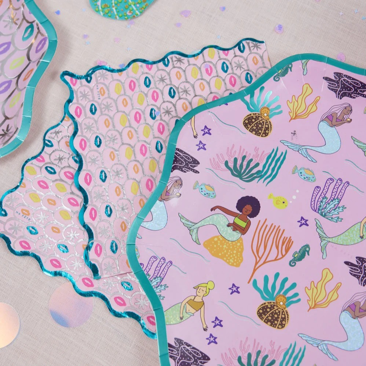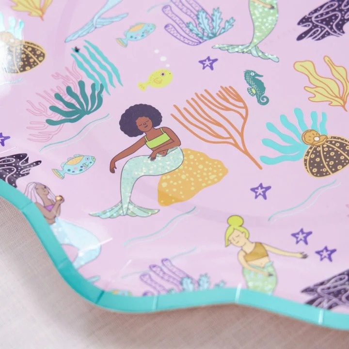 أبهري ضيوفك في حفلتك القادمة بأطباقنا الورقية المستوحاة من عالم البحار! تتميز هذه الأطباق بشكلها الفريد والمرح، مع لمسة نهائية لامعة من ورق القصدير تلفت الأنظار! يتألق لونها الوردي برسومات جميلة لحوريات بحر ظريفة وألوان زاهية، مما يجعلها مثالية لأي حفلة بطابع عالم البحار أو حورية البحر! هذه الأطباق ليست أنيقة فحسب، بل متينة أيضًا، ومثالية لحمل جميع الوجبات الخفيفة والحلويات. انغمسي في المرح وأضيفي أطباق عشاء حورية البحر هذه إلى لوازم حفلتك اليوم!