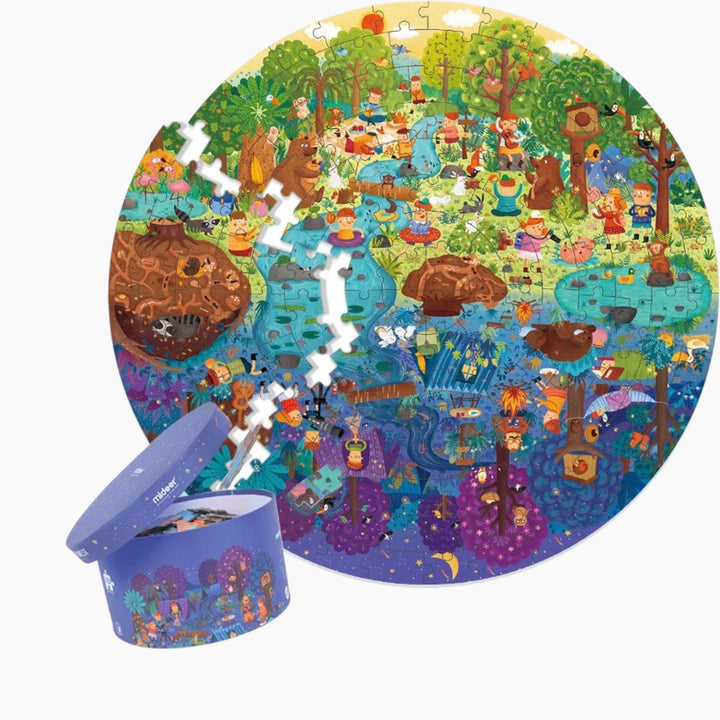 Discover the magic of a forest's transformation with the Mideer 150P Round Puzzle, "A Day In The Forest." This engaging puzzle invites children aged 5 and up to explore the wonders of nature as day turns into night.