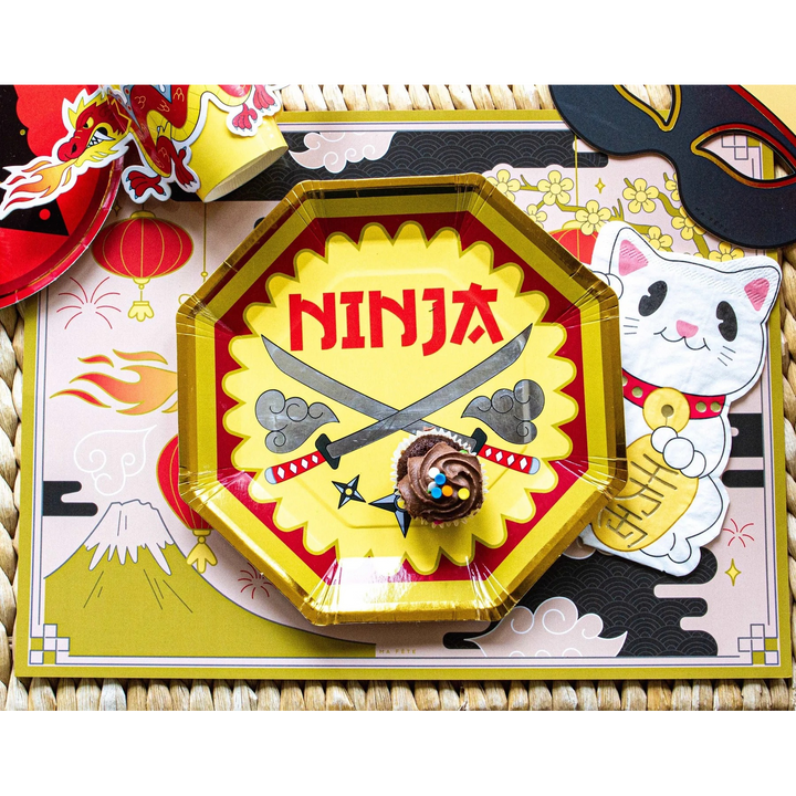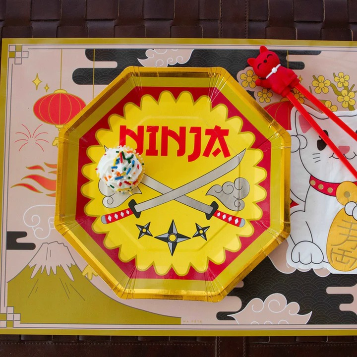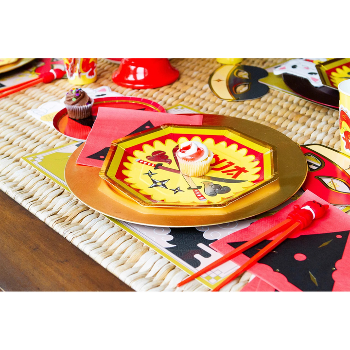 استمتع بحلويات عيد ميلاد شهية مع 8 أطباق عشاء بتصاميم سيوف النينجا، مزينة برقائق فضية وذهبية لتضفي على طعام حفلتك لمسةً من المرح!