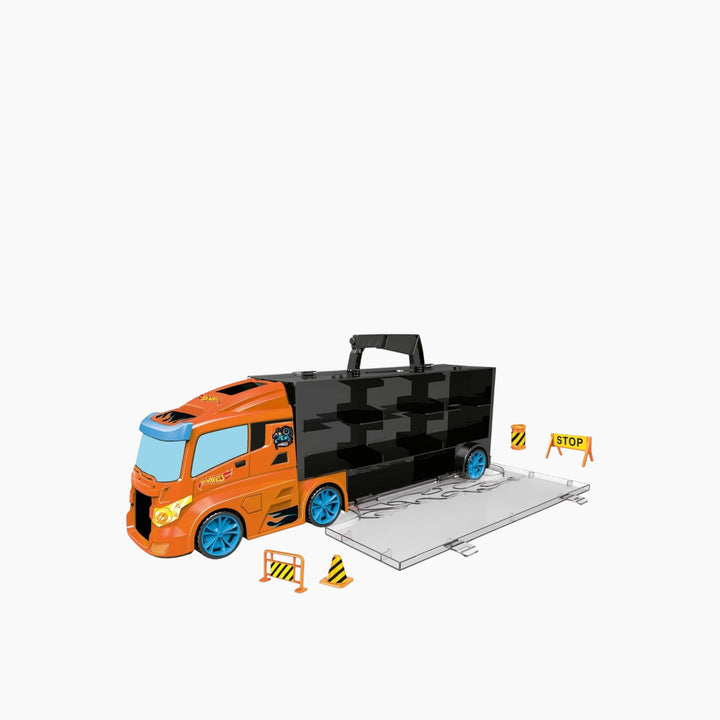 Perfect for aspiring racers and collectors, this transporter offers easy access to its cargo and includes everything needed for immediate fun. It's a fantastic way to store and transport a favorite collection of miniature vehicles.