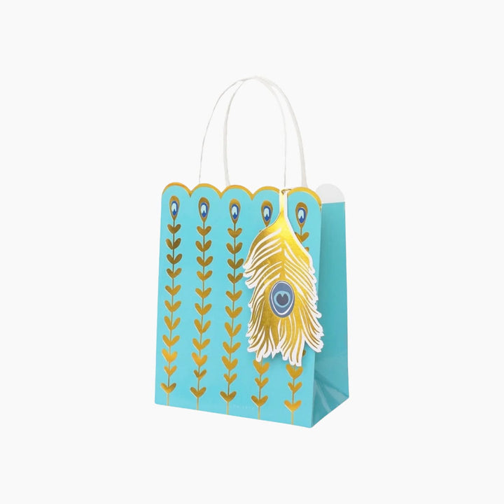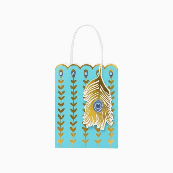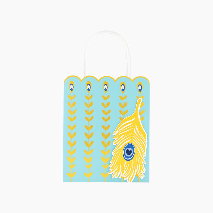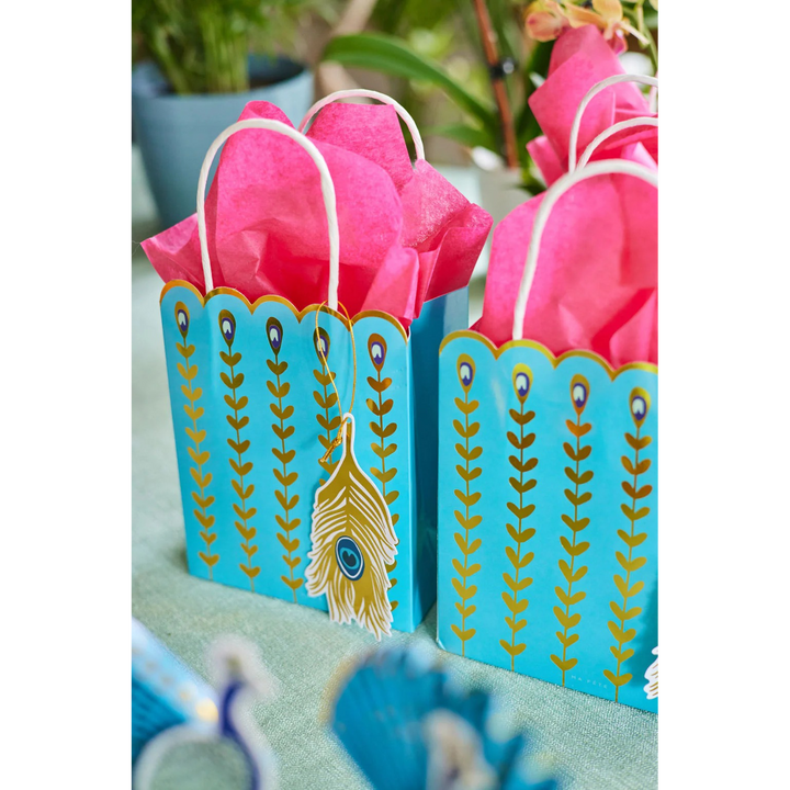 أهدي ضيوفك لمسةً من الاحتفال مع أكياس "ما فيت" الورقية بطابع الطاووس، فهي هدايا مثالية لحفلتك الاستوائية القادمة أو مناسبة أطفالك. كل كيس مزين بريش الطاووس...