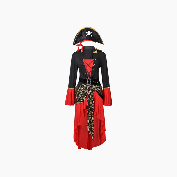 - تصميم كلاسيكي: زي القرصان التقليدي مع قبعة وشريط مطابق.