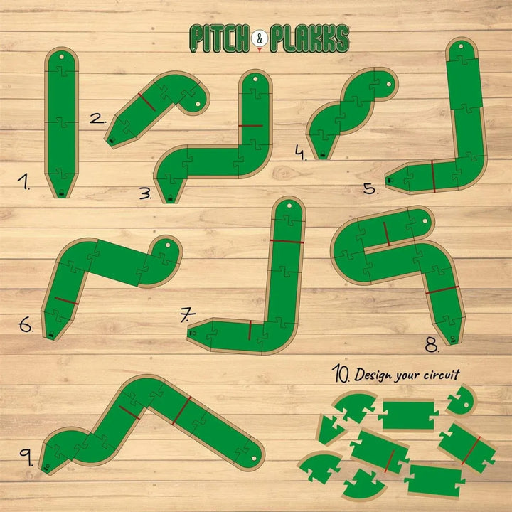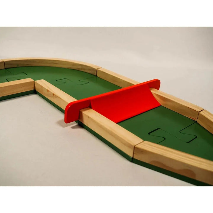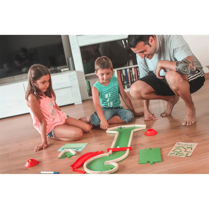 - Crafted from FSC-certified wood for sustainable play.- Offers over 100 unique course configurations through puzzle-like assembly.