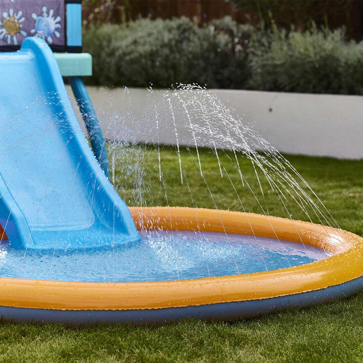 - Features three exciting water accessories: waterblaster, 8-pattern sprayer, and bubble blower.- Includes a water slide and splash pad with integrated sprayers.