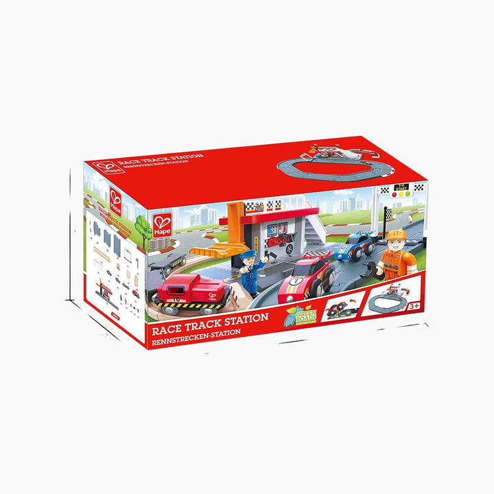 - Includes: Wooden race station, gates, elevator, multiple tracks, and accessories