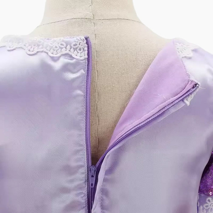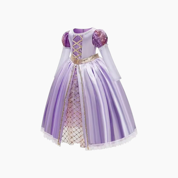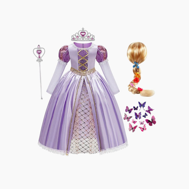 - تصميم دقيق: مزين بشكل جميل بتفاصيل لامعة وتطريز رقيق يحاكي إطلالة رابونزل الأيقونية.