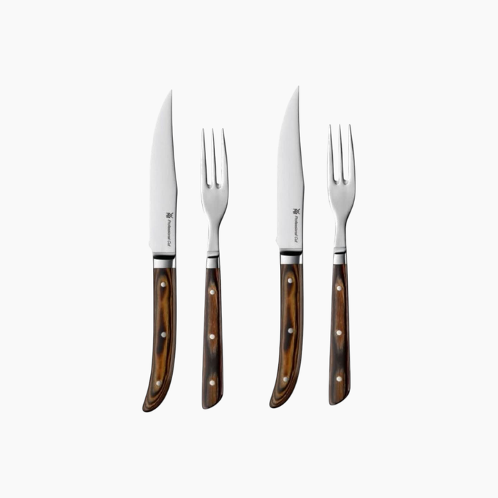 يتضمن الطقم سكينين لشرائح اللحم وشوكتين، جميعها بمقابض خشبية أنيقة.