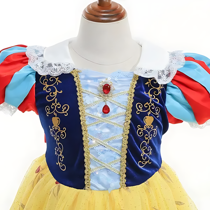 - تصميم دقيق: يتميز بصدير مزخرف بتطريزات تعكس الأناقة الخالدة لأميرة القصص الخيالية.