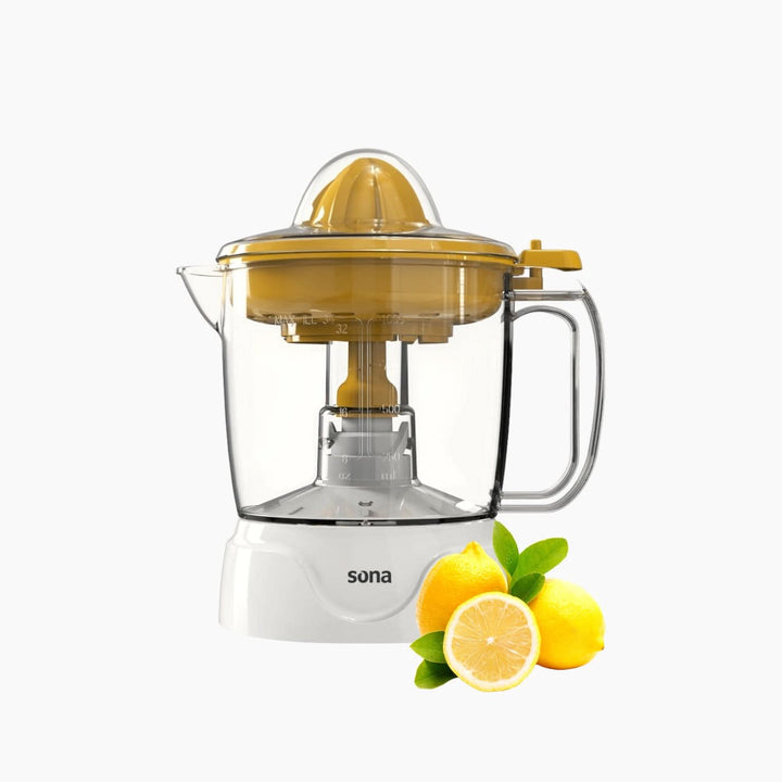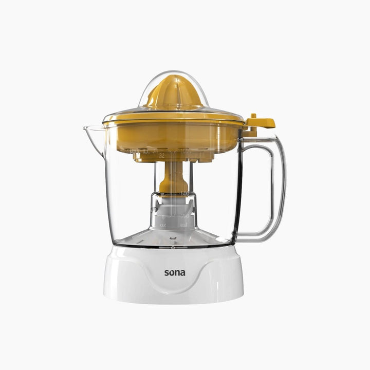 عصارة سونا مع اتجاهين دوران 30 وات 1 لتر مع محرك نحاسي: لا، قفل أمان مزدوج: لا، أنبوب تغذية كبير كامل للتفاح: لا، السعة: 1 لتر، سعة إبريق العصير: 1 لتر، عدد السرعات: 1، اللون: أصفر، العلامة التجارية: سونا.
