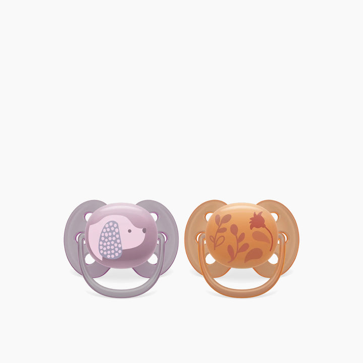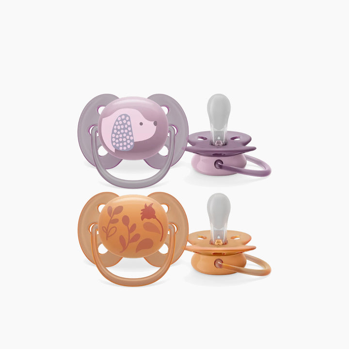 Offers an ultra-gentle soothing experience that adapts to a baby’s every curve for soothing and skin comfort. This premium pacifier blend of tender flexibility and thoughtful design provides comfort and oral support for infants aged 6 to 18 months.
